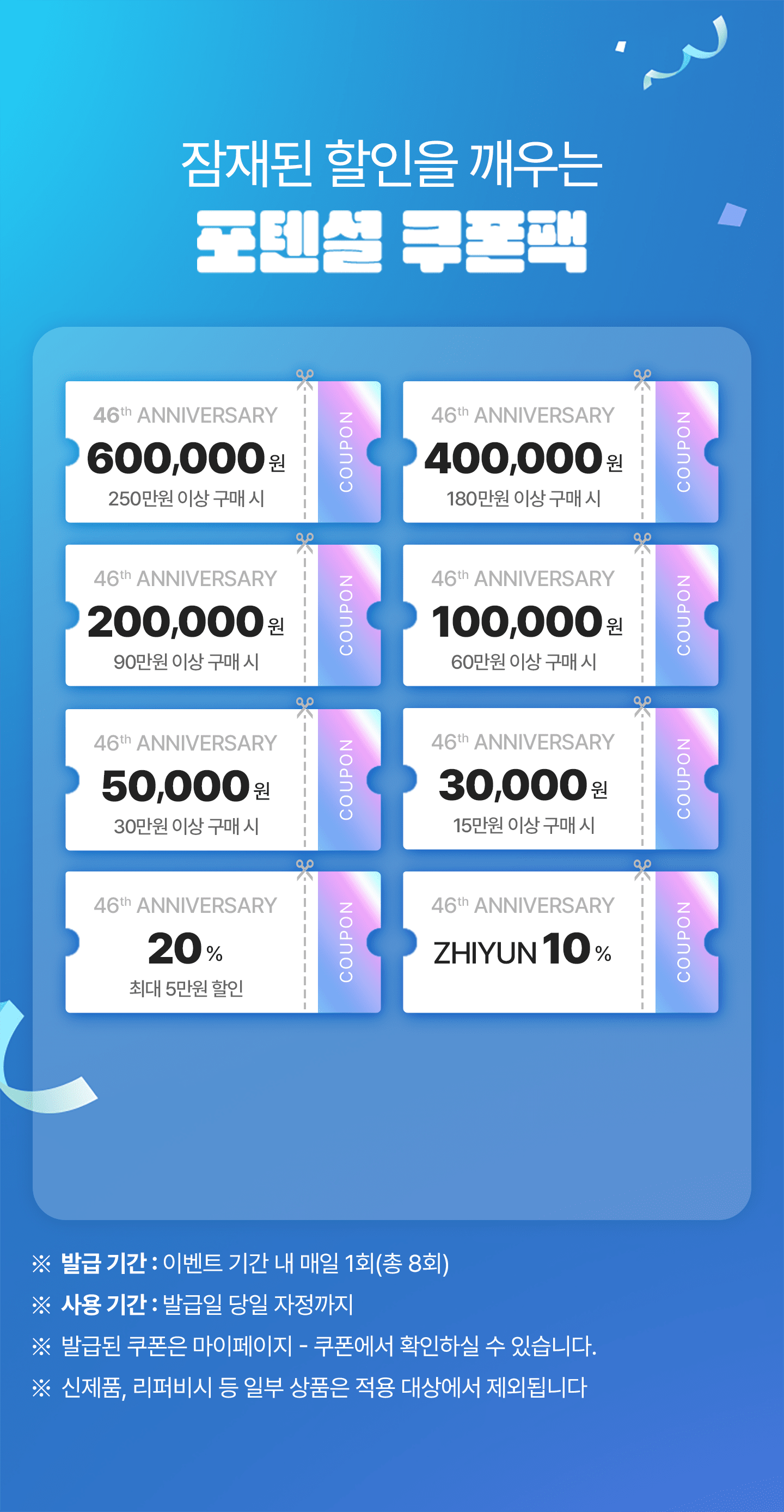 • 1만원 할인쿠폰 : 5만원 이상 결제 시, 10% 할인쿠폰 : 1만원 이상 결제 시, 최대 5만원 할인